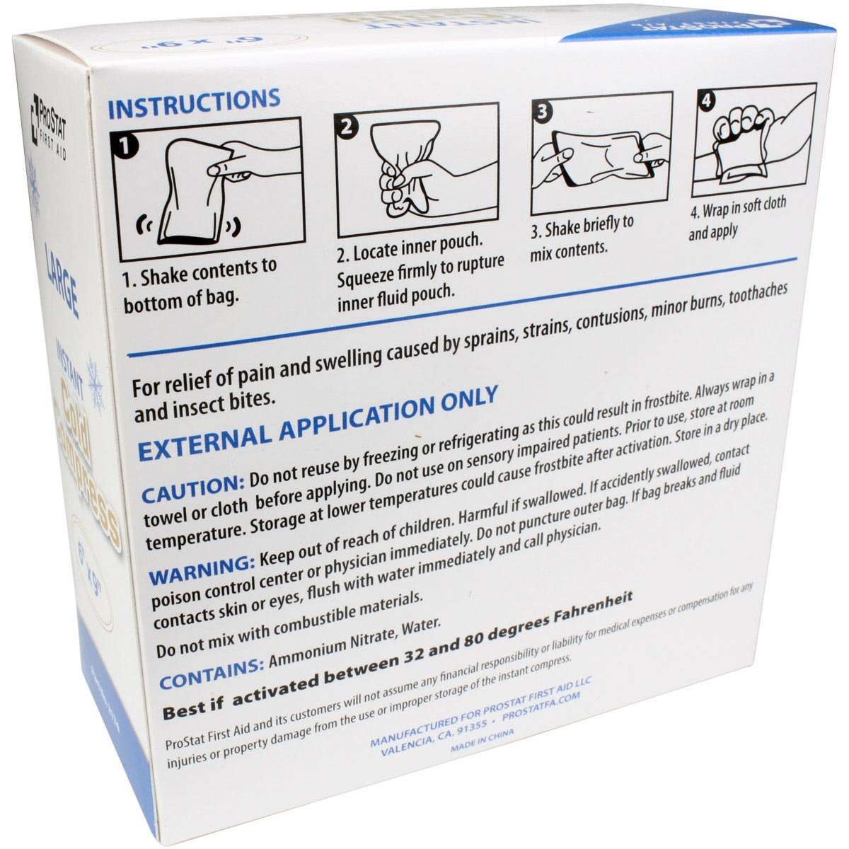 Our 6" x 9" Instant Cold Compress temporarily relieves minor pain and swelling for sprains, strains, aches, bruising, and sore joints. The Urgent First Aidâ„¢ instant cold packs are conveniently disposable with no pre-chilling required for quick, effective relief. No messy ice bags needed. Just shake, squeeze, shake again and apply for instant cool comfort and treatment of injuries.