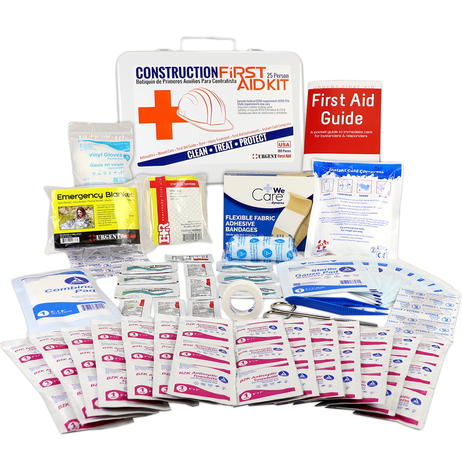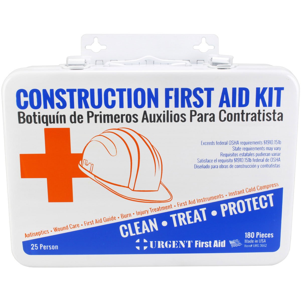 OSHA’s 1926.50(d)(1) requires that employers make certain “first aid supplies shall be easily accessible when required.†and, 1926.50(d)(2) requires that “the contents of the first aid kit shall be placed in a weatherproof container.†This is why Urgent First Aid™ assembles these construction site first aid kits (right here in the USA) in sturdy gasketed powder-coated steel first aid boxes that help keep the dust and moisture out of your first aid supplies. This 180 piece construction first aid kit exceeds federal OSHA requirements and is perfect for work-vehicles and to have while on the job-site. The Kit includes everything you need from bandages, compresses, triangular/sling bandage, gauze pads, antiseptic towelettes, first aid tape, exam gloves, burn relief, even an instant cold compress to treat those contusions from on-the-job bumps and more – plus the kit designers went further, too, by upping the quality standard and including only 12-ply gauze pads instead of the less expensive (and less effective) 8-ply or 4-ply.